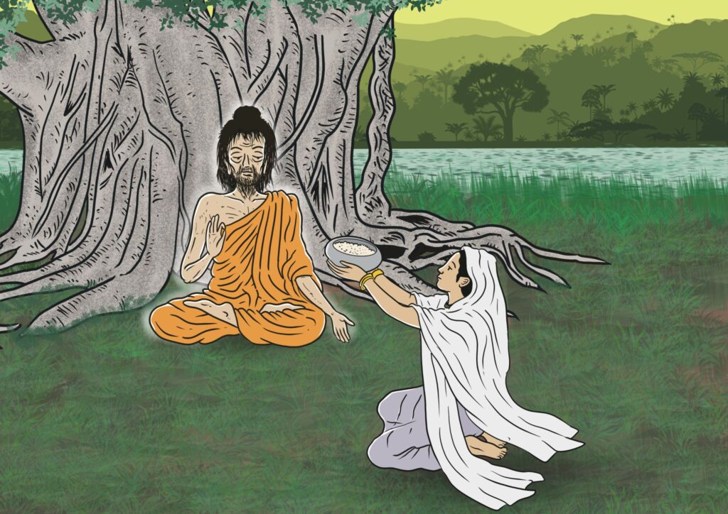 Sujata offering food to a famished Siddhattha. Artwork by Colin Goh.