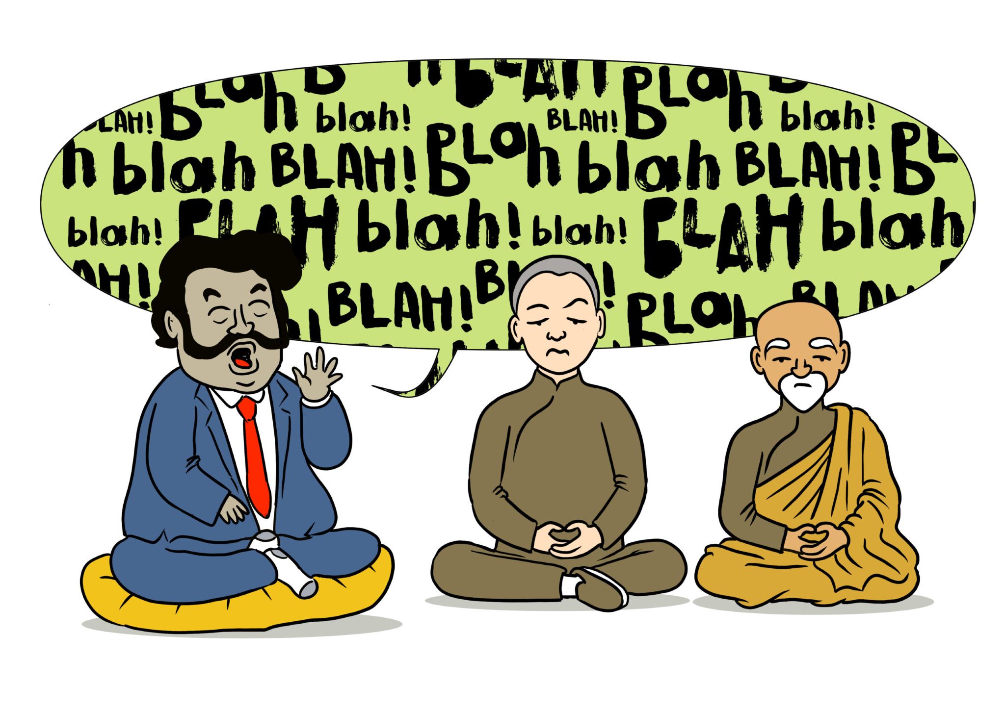 As usual, though, the Buddha provided some useful practical guidelines. For monks, he prescribed right speech as abstinence from four things: false speech, divisive speech, harsh speech, and idle chatter.[1] The first three makes immediate sense, the last one you may find a little curious. The reason for Buddhist monks to abstain from idle chatter is that they are supposed to practice preserving a certain degree of mental stillness and mindfulness at all times, and idle chatter interferes with that.