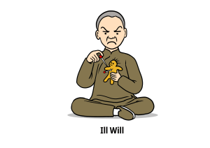 Ill will refers to mental states born of aversion, which include anger, hatred, resentment, jealousy and envy.  These feelings can be directed towards other people, objects, situations, or even oneself.