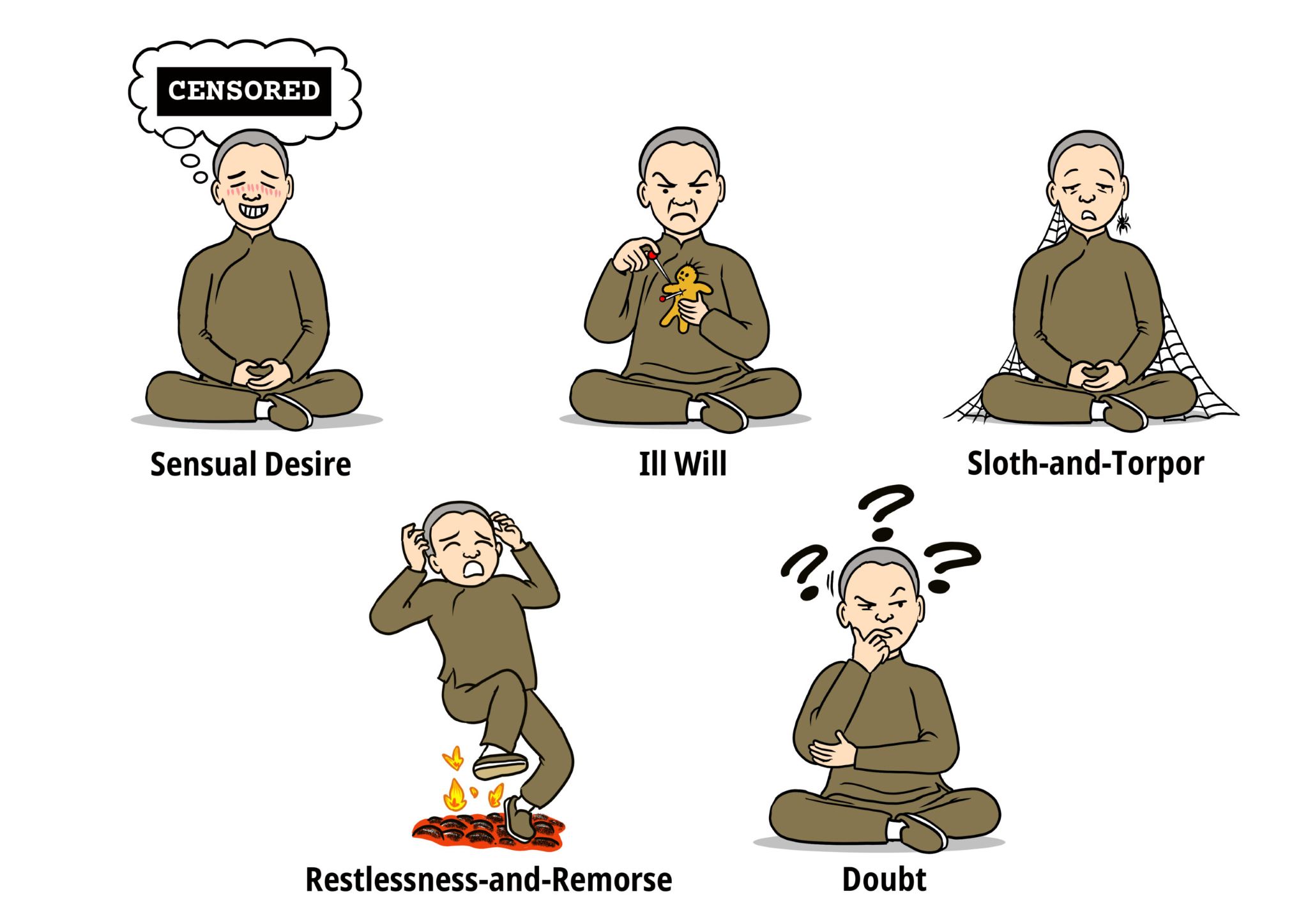 The five hindrances are mental obstacles that hinder the mind from meditative concentration.  Beyond that, they also hinder the mind from wisdom in general, which means that they don’t just operate during meditation, they also operate in daily life. The five are: