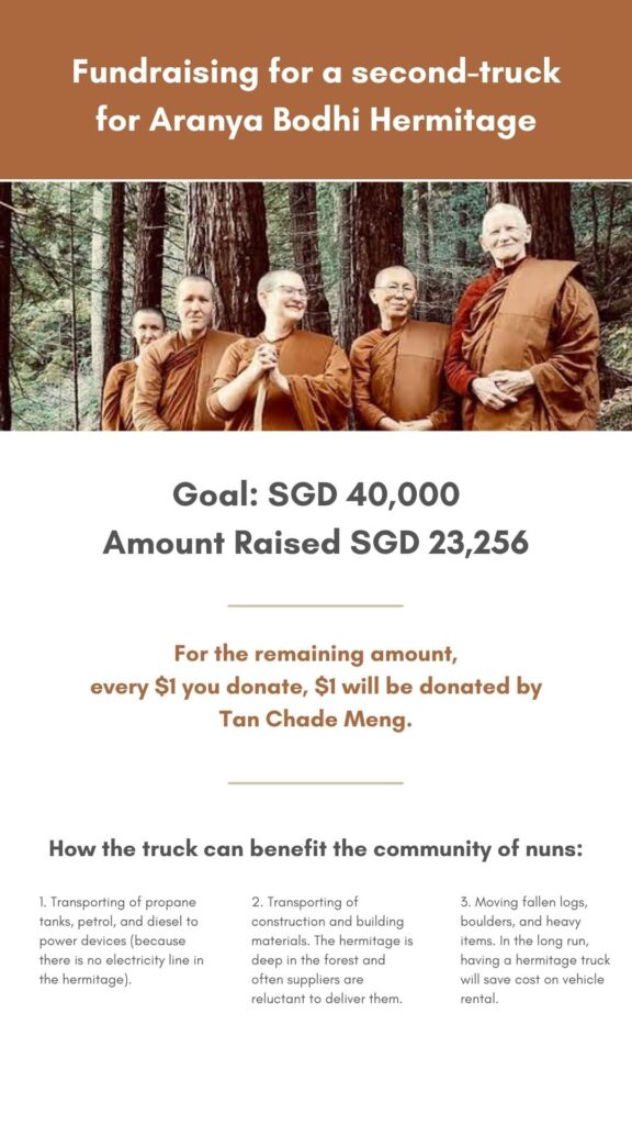 Some friends have already raised SGD (Singapore dollars) 23,256. They only need about SGD 20,000 (US$ 14,500+) more. To help them reach the finish line, I will match your donations to the Aranya Bodhi Hermitage, dollar for dollar, up to SGD 10K. (As a bonus, I’ll even suggest to them to name their new truck “Mahayana”.)