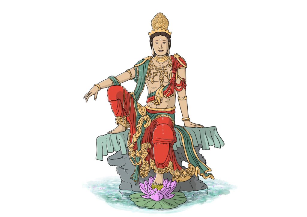 Here, we see two different renditions of Guan Yin Bodhisattva: one as a compassionate female figure, serene and wise, listening to the sounds of the world. The other, as a richly adorned figure seated in a posture of royal ease, also known as Water Moon Guan Yin Bodhisattva.