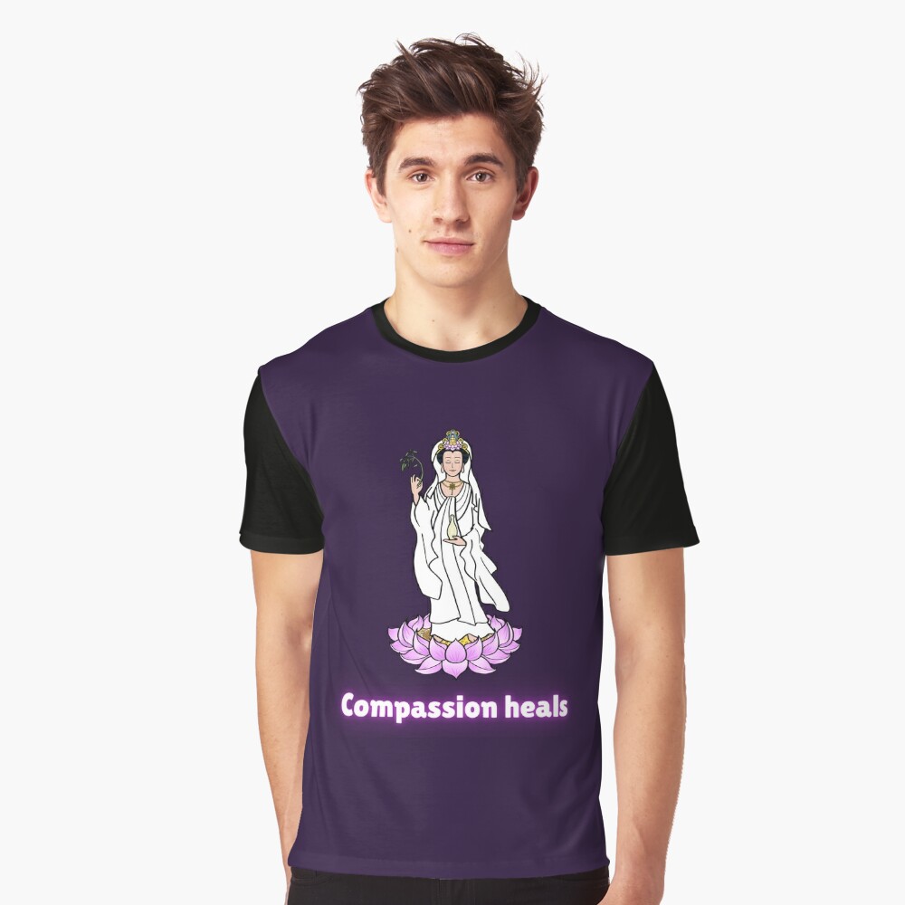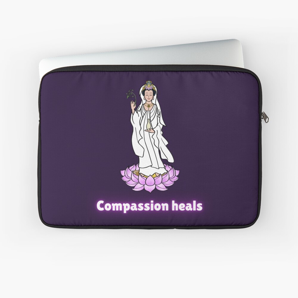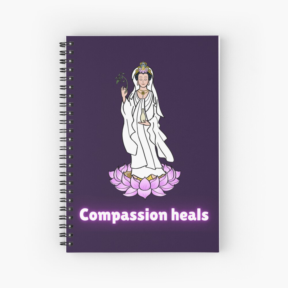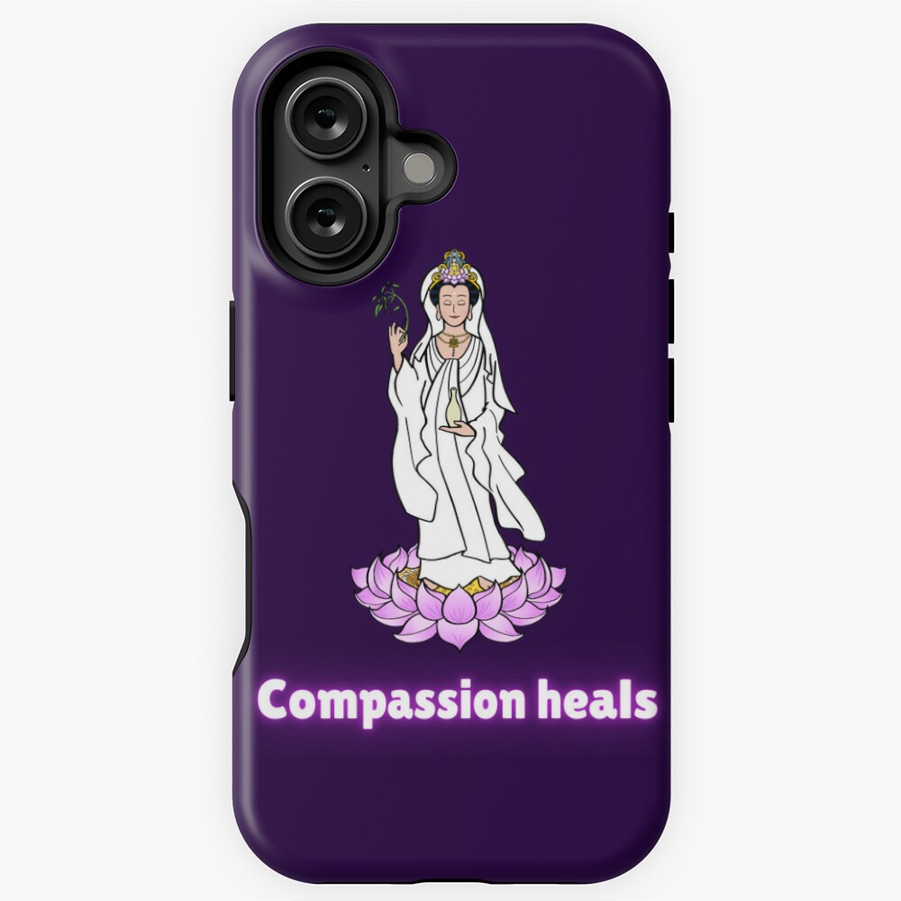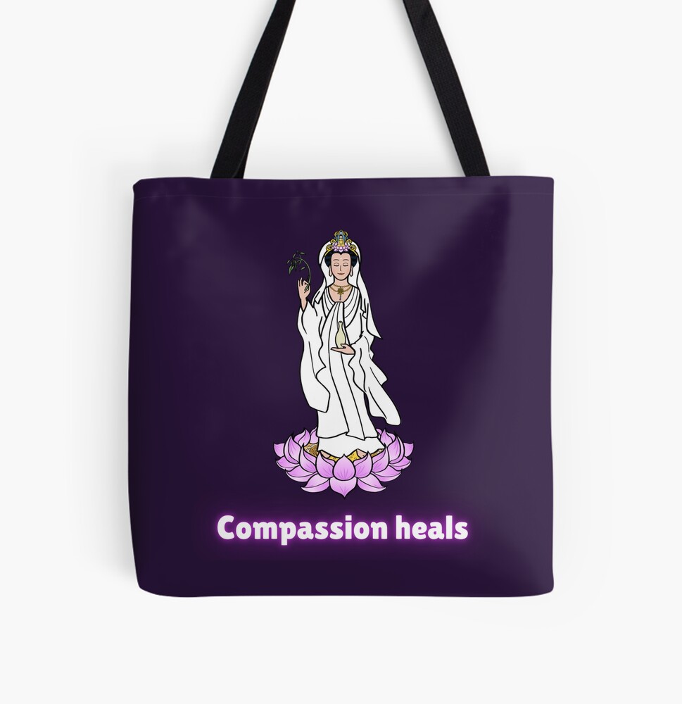 • “Compassion heals” Series: A beautiful depiction of Guan Yin Bodhisattva standing on a lotus, radiating peace with the reminder “Compassion heals”. Place it in your home or gift it to a friend as a reminder of the healing power of compassion.